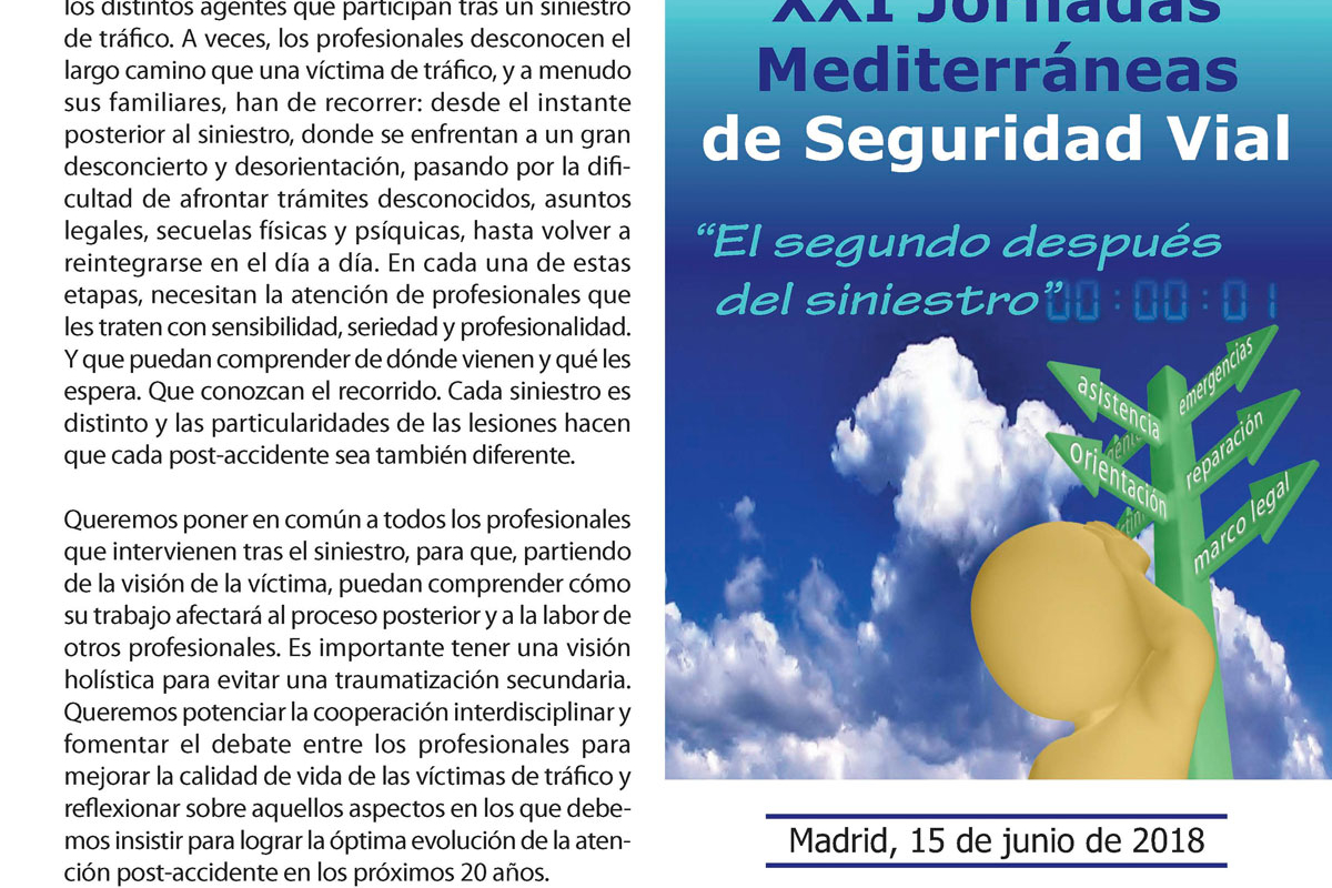 L’objectiu d’aquestes jornades és, per tant, posar en comú a tots els professionals que intervenen després del sinistre, perquè, partint de la visió de la víctima, puguin comprendre com el seu treball afectarà al procés posterior i al treball d’altres professionals. “Volem potenciar la cooperació interdisciplinària i fomentar el debat per millorar la qualitat de vida de les víctimes de trànsit. Així com reflexionar sobre com hauria d’evolucionar l’atenció post-accident en els propers 20 anys”.