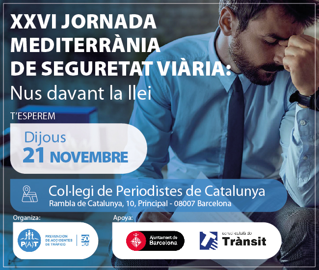 El proper 21 de novembre, de 9:30 a 14:00 hores, al Col·legi de Periodistes de Catalunya, celebrem les XXVI Jornades Mediterrànies de Seguretat Viària sota el lema “Nus davant la Llei”, una oportunitat única per aprofundir en un problema que ens afecta a tots i que reclama canvis legislatius urgents.