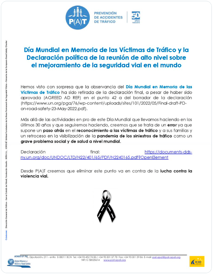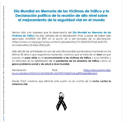 A pesar de todo, se eliminó de la declaración final cualquier referencia a la observancia del Día Mundial en Honor a las Víctimas de Tráfico, cosa que consideramos que es un error tal y como manifestamos a través de un comunicado en su momento.