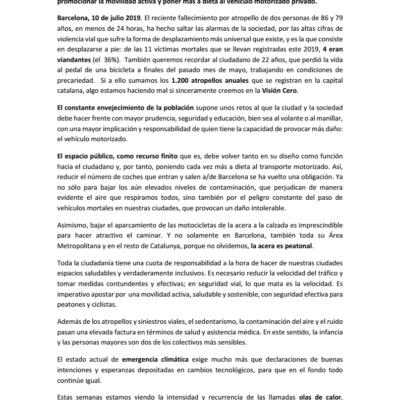 De las 11 víctimas mortales que se llevan registradas este 2019 en Barcelona, 4 eran peatones (el 36%). Por ello creemos imprescindible Imprescindible la mejora de la seguridad vial, promoción de la movilidad activa y la reducción del uso del vehículo motorizado privado