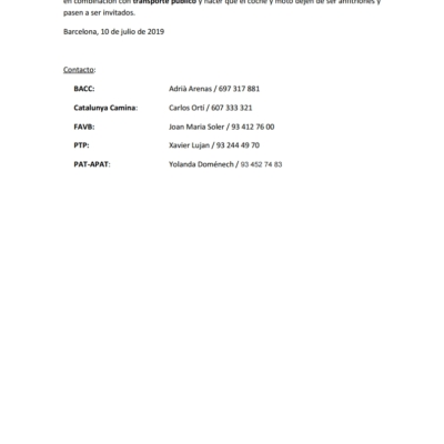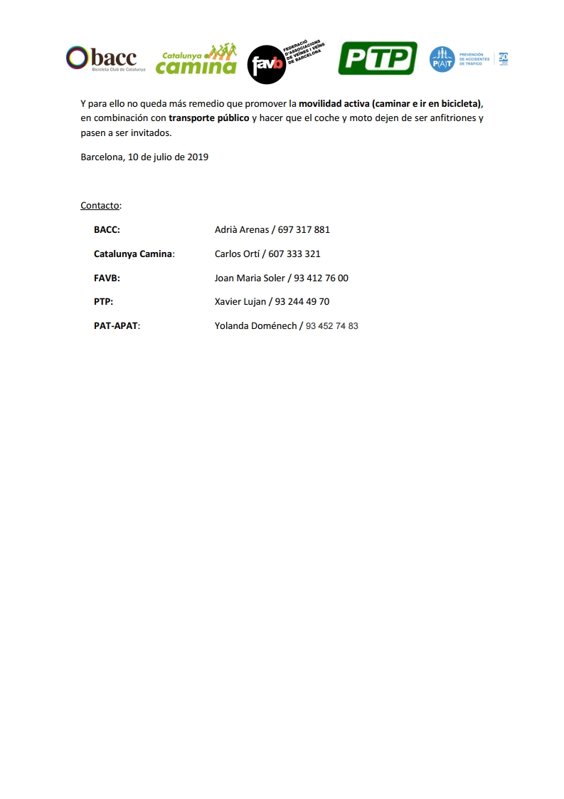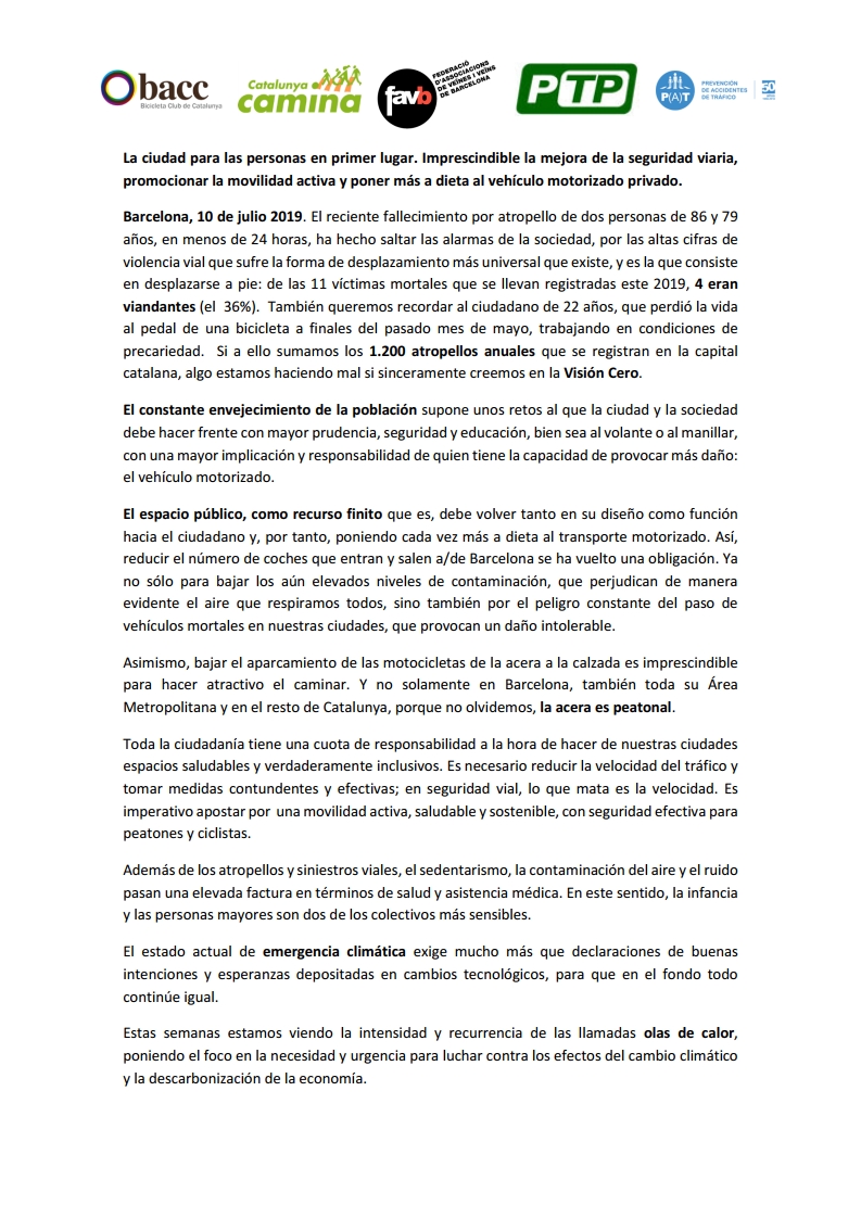 Las entidades @CatalunyaCamina, @FAVB, @PTP, @P(A)T y @BACC exigimos un compromiso firme para reducir las víctimas de siniestros de tráfico en Barcelona, el área Metropolitana y Cataluña.