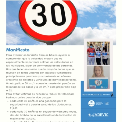 En este sentido cabe apuntar que durante el último año, la asociación se ha unido a la campaña internacional de la ONU #Love30 y #StreetsForLife, con el objetivo de avanzar en la visión cero y ayudar a comprender que la velocidad mata y especialmente en las zonas urbanas. Así, un vehículo a 50 km/hora causa la muerte del peatón en el 50% de los casos, bajando a 30 km/hora a un 5%.